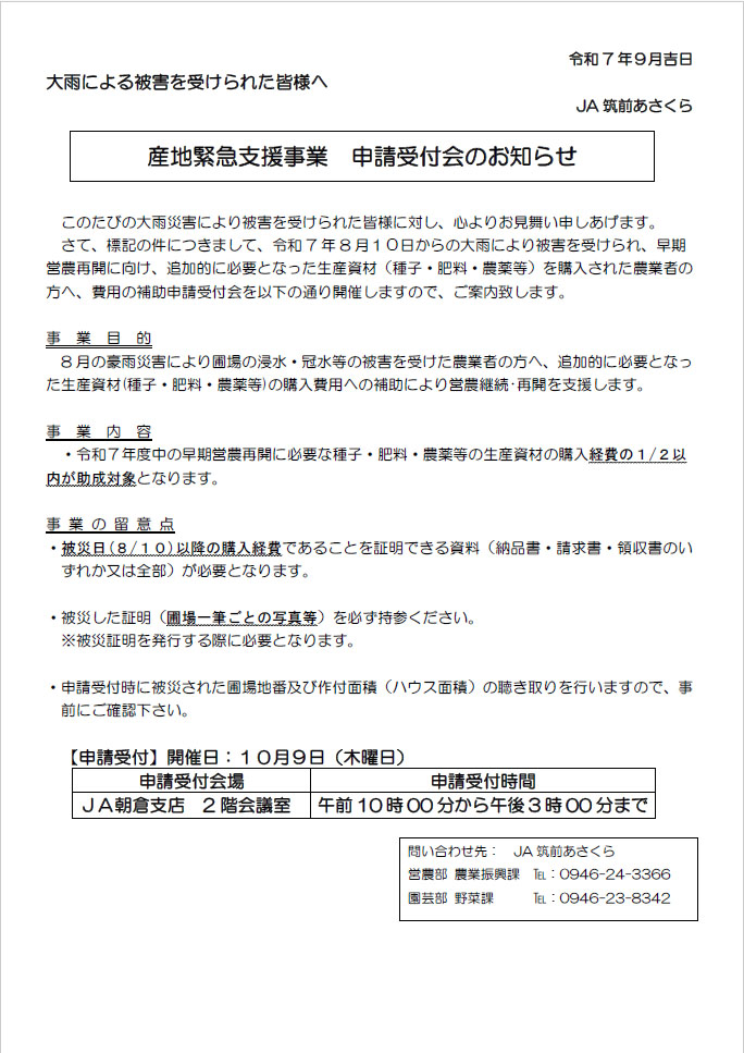 全体 業務 営農 金融 食育 採用 地域ニュース 総代会 その他 JA筑前あさくらの新着情報「業務」「営農」「金融」「食育」「採用」「地域ニュース」「総代会」「その他」のカテゴリー分類にてご案内いたします。 2025.09.30 産地緊急支援事業 申請受付会のお知らせ このたびの大雨災害により被害を受けられた皆様に対し、心よりお見舞い申しあげます。 さて、標記の件につきまして、令和7年8月10日からの大雨により被害を受けられ、早期営農再開に向け、追加的に必要となった生産資材(種子・肥料・農薬等)を購入された農業者の方へ、費用の補助申請受付会を以下の通り開催しますので、ご案内致します。