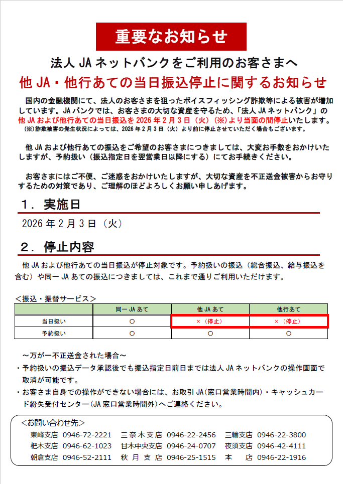 つきましては、お客さまの大切な資産を守るため、JAバンクでは他JA(JA筑前あさくら以外)および他行宛の当日振込を2026年2月3日(火)より当面の間停止させていただきます。詳しくは下記内容をご確認ください。